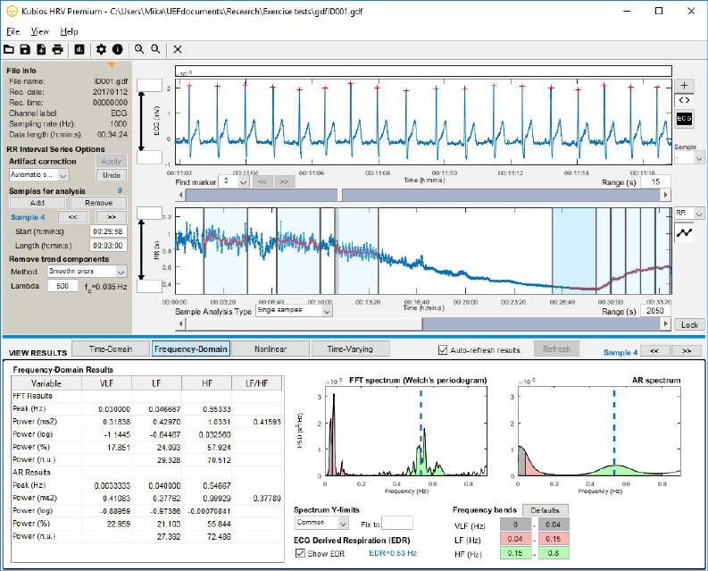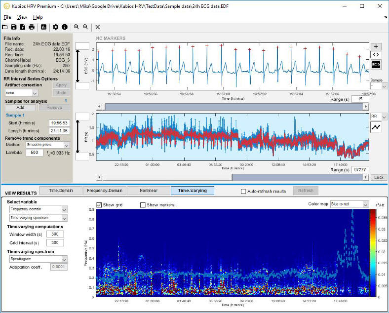 2.   Kubios HRV Premium: für wissenschaftliche Untersuchungen und den professionellen Anwender. Die Premium Version ermöglicht, die meisten gängigen Herzfrequenz-Messgeräte und EKG-Geräte auszulesen und deren Daten zu analysieren. Ebenso kann die Atmung über das EKG berechnet und fehlende Herzschläge oder Artefakte korrigiert werden. Es besteht die Möglichkeit der zeitabhängigen Analyse (z.B. 24-Stunden-Trends der HRV-Parameter), sowie der Analyse nicht-linearer Parameter. Die Daten können dann auch exportiert werden, zum Beispiel in SPSS. Insgesamt ermöglich die Premium-Version eine genauere, detaillierte und aussagekräftigere Auswertung der HRV. http://www.kubios.com/hrv-premium