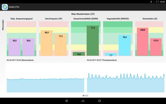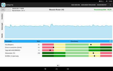 Die Auswertung der HRV-Messung zeigt nach dem übersichtlichen Ampelprinzip schnell gute oder kritische Werte des Klienten an. Klassische Balken- und Streuungsdiagramme ermögliche die detailliertere Auswertung der Messung.