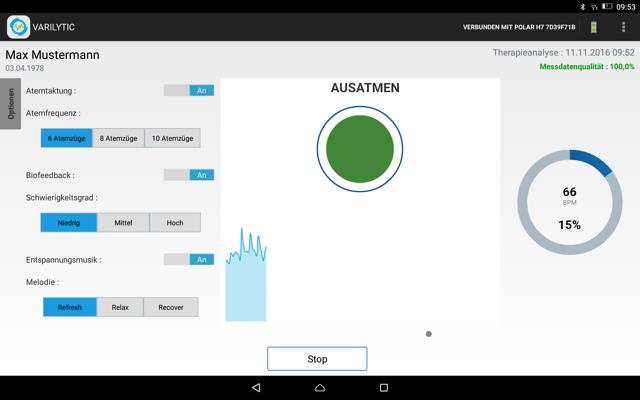 Die Biofeedback-Übung („HRV-Therapieanalyse“) kann individuell an den Klienten angepasst werden. Die Atemfrequenz, sowie der Schwierigkeitsgrad können definiert und bewertet werden.